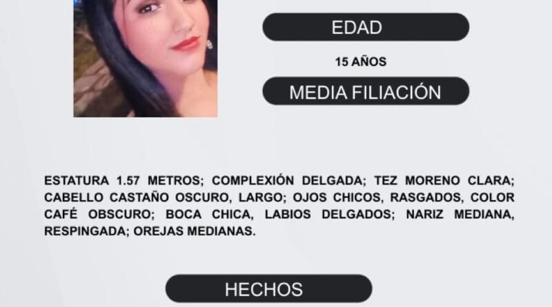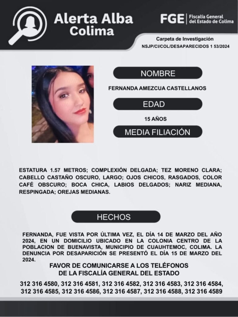 El Protocolo Estatal Alerta Alba, solicita su apoyo y colaboración para difundir los datos de Fernanda Amezcua Castellanos de 15 años de edad, que no ha sido localizada. Fue vista por última vez el 14 de marzo de 2024 en un domicilio de la colonia Centro de la población de Buenavista del municipio de Cuauhtémoc. Favor de comunicarse a los teléfonos de la Fiscalía General del Estado. 312 316 45 80, 312 316 45 81, 312 316 45 82, 312 316 45 83, 312 316 45 84, 312 316 45 85, 312 316 45 86, 312 316 45 87, 312 316 45 88, 312 316 45 89.
