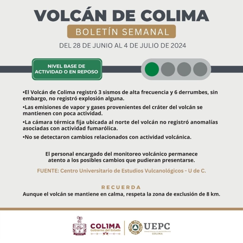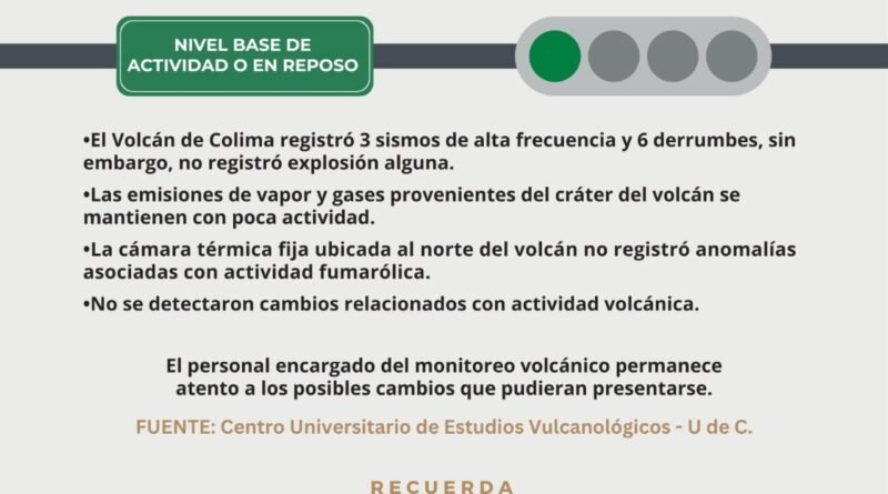 La Unidad Estatal de Protección Civil (UEPC) del Gobierno del Estado de Colima, informó que el Volcán de Fuego de Colima permanece en ‘semáforo verde’ y los parámetros de monitoreo indican que se encuentra en calma.