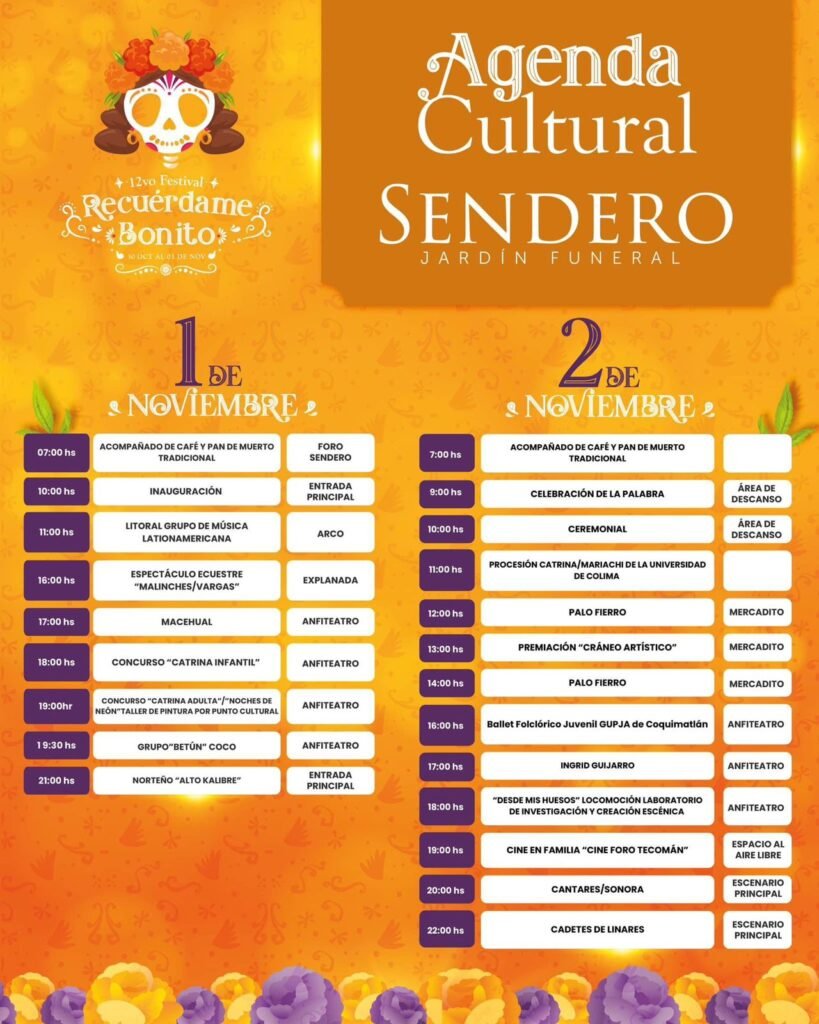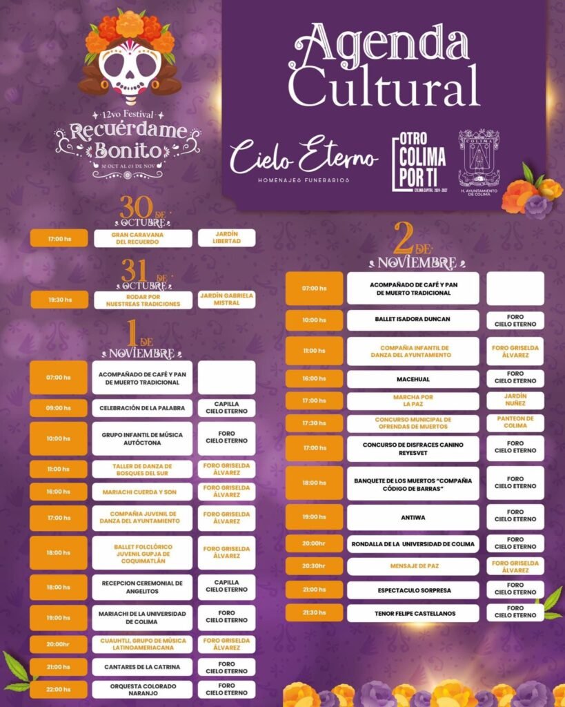 El festival contará con una serie de actividades culturales y artísticas, que incluyen el tradicional altar de muertos, presentaciones de danza y música, así como un recorrido histórico por el panteón. El momento culminante de esta gran celebración se llevará a cabo la noche del 2 de noviembre, con un espectacular show de drones, luces láser y pirotecnia, diseñado para iluminar el cielo nocturno de Colima en un tributo visual a los difuntos.