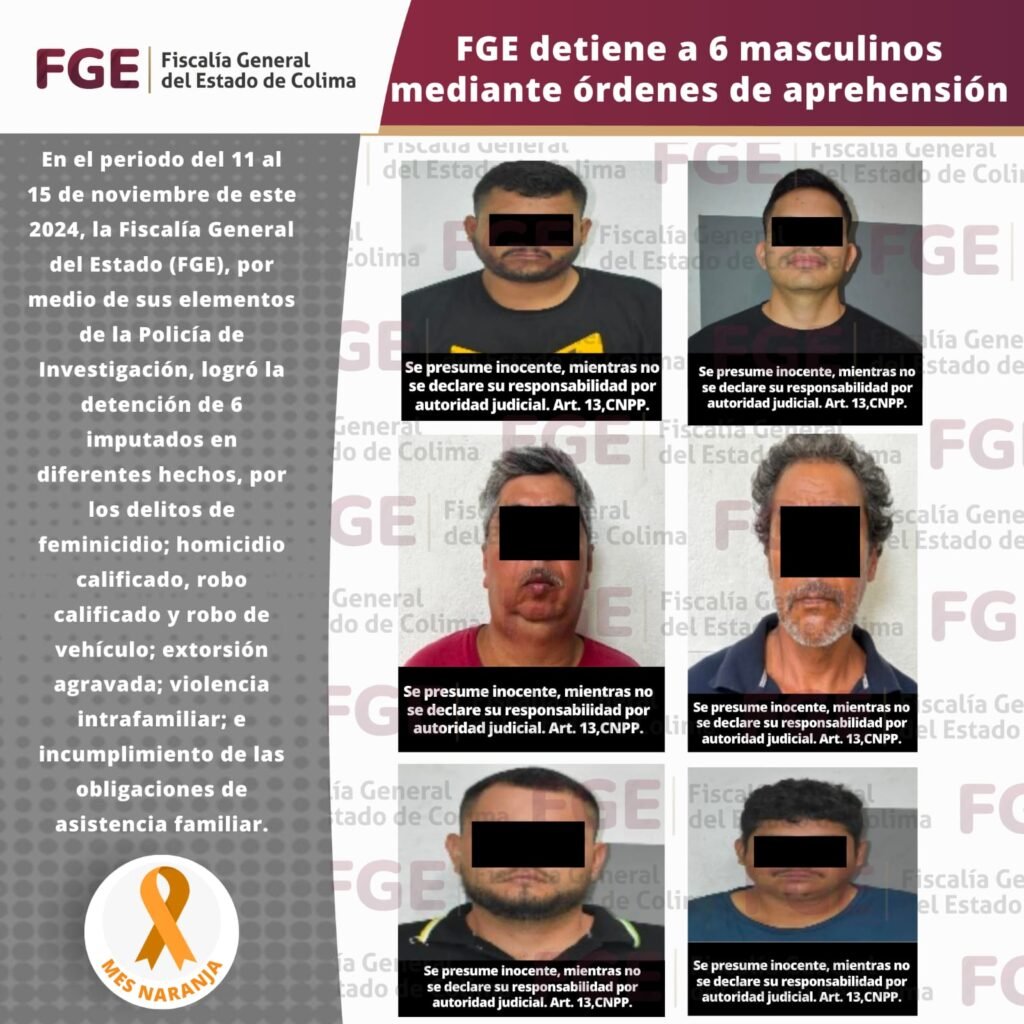 En el periodo del 11 al 15 de noviembre de este 2024, la Fiscalía General del Estado (FGE), por medio de sus elementos de la Policía de Investigación, logró la detención de 6 imputados en diferentes hechos, por los delitos de feminicidio; homicidio calificado, robo calificado y robo de vehículo; extorsión agravada; violencia intrafamiliar; e incumplimiento de las obligaciones de asistencia familiar.