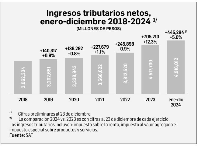 SAT: en 2024 los ingresos crecieron 316 mil mdp