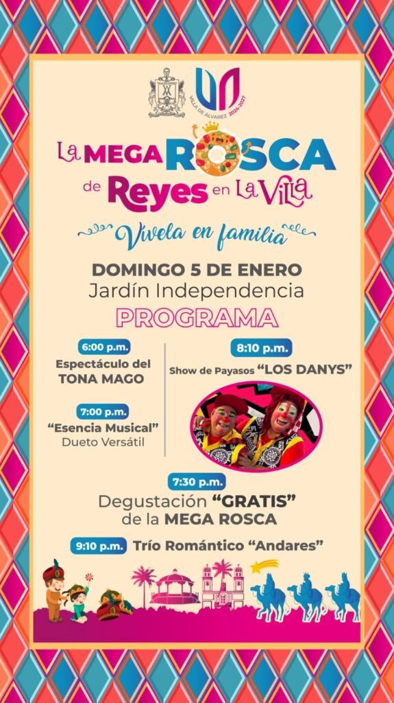 A las 8 de la noche habrá un show de payasos, con Los Danys, y las actividades de la Mega Rosca de Reyes en la Villa concluirán con el Trío Romántico Andares, que iniciará su presentación a partir de la 9:10 de la noche.