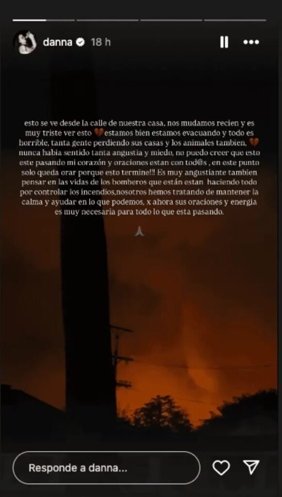 Según explicó, recién cambió de residencia, y aunque se encuentra bien en medio del desastre, lamentó que otros no corrieran con la misma suerte que ella: “Nos mudamos recientemente, y es muy triste ver esto desde nuestra casa. Estamos bien, estamos evacuando, pero es horrible ver cuántas personas están perdiendo todo, incluyendo sus hogares y los animales que también sufren las consecuencias”, dijo.