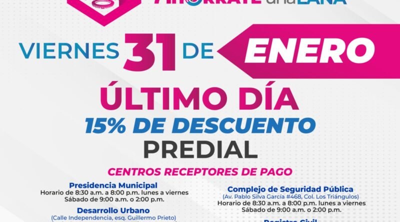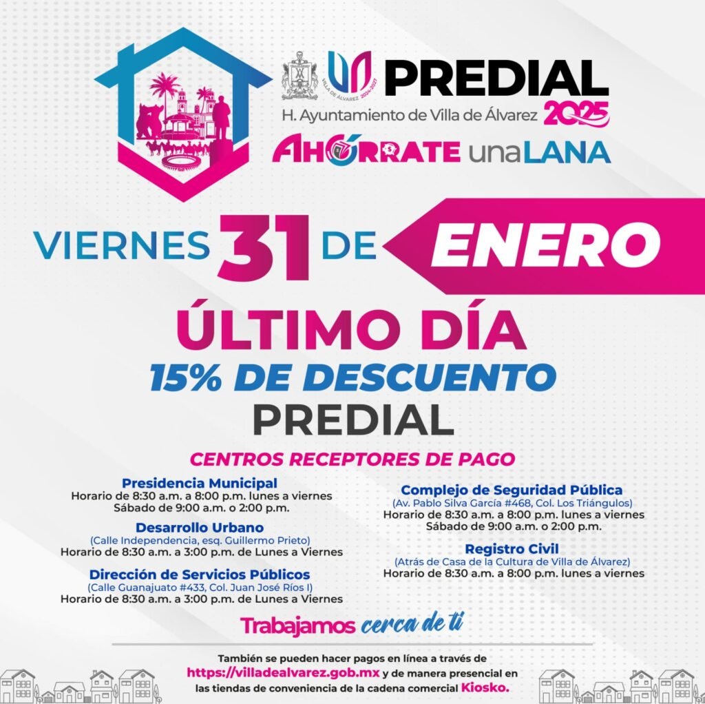 Este viernes 31 de enero vencerá el plazo para obtener el descuento del 15 por ciento que el Ayuntamiento de Villa de Álvarez ofrece a los contribuyentes del Impuesto Predial, esto para quienes paguen de manera adelantada la anualidad de esa contribución correspondiente al año 2025.