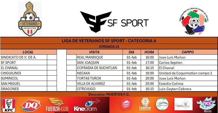 SF Sport será anfitrión del San Joaquín, a las 5 de la tarde, en el Carlos Septiém; a las 6, Chigüilines encarará a Necaxa, en el rectángulo 1 de la Unidad de Coquimatlán; cierran a las 8 de la noche, Sumincol frente a Tortas Turok, en el José Luis Mañón.