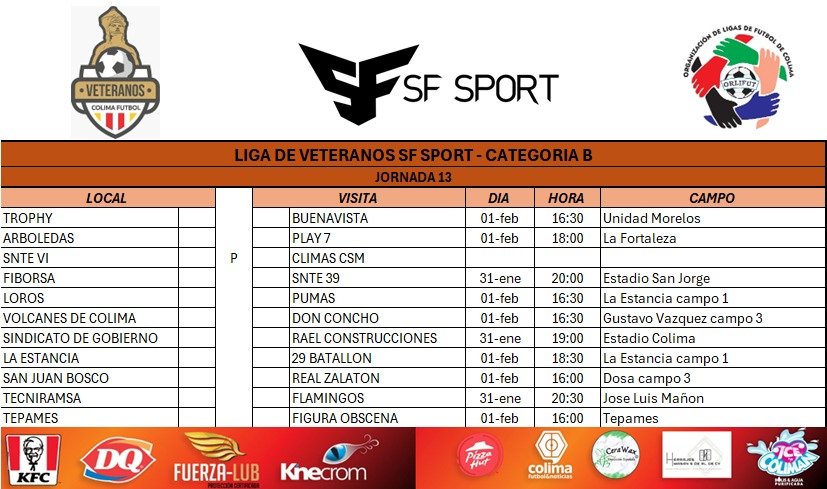 En cuanto a los marcadores de la Fecha 12, Rael Construcciones le ganó 2-1 a Arboledas; Buenavista 3-1 a La Estancia; 29 Batallón 4-2 Tepames; Climas CSM 4-3 Sindicato de Gobierno; Don Concho 4-3 Tropy; Play 7 2-2 Tecniramsa; Fiborsa 5-0 Flamingos; Pumas 1-6 Volcanes de Colima; Real Zalatón 1-18 SNTE 6; SNTE 39 1-2 Loros.