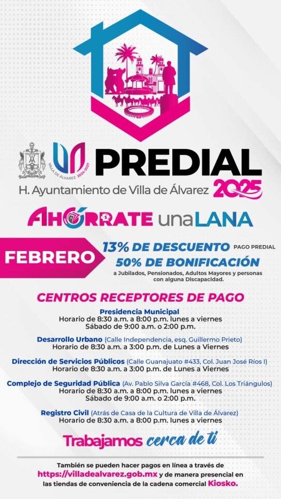 A partir de este sábado primero de febrero, el Ayuntamiento de Villa de Álvarez ofrecerá un descuento del 13 por ciento a los contribuyentes del Impuesto Predial que paguen por adelantado el gravamen correspondiente al año 2025.