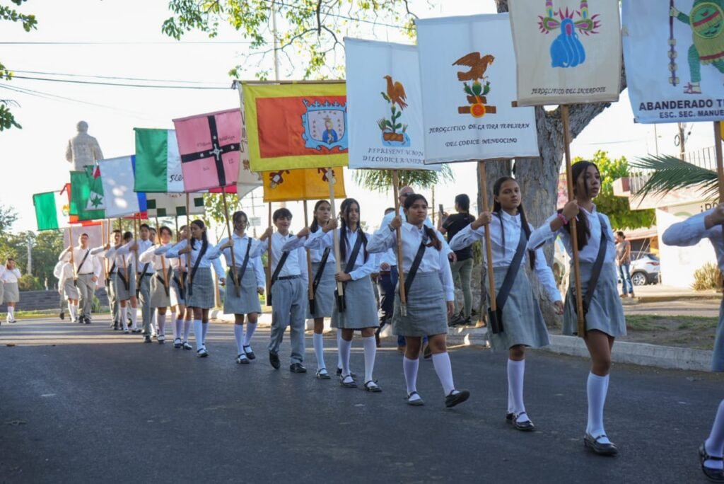 Alumnos y alumnas de la Escuela Secundaria José Vasconcelos Turno Vespertino desfilaron por las avenidas General Manuel Álvarez y J. Merced Cabrera  mostrando el Abanderamiento Tlaxcalteca, el Jeroglífico del Sacerdote Tenoch, el Códice Mendocino, el Códice Ramírez, la Bandera de la Conquista, la Bandera de la Cruz de Borgoña, el Estandarte de Hidalgo, la Bandera de Siera, la Bandera de Morelos, la Bandera Doliente de Hidalgo, la Bandera de Los Insurgentes, la Bandera de las Tres Garantías, el Pabellón de Iturbide, la Bandera Constituyente, la Bandera del Imperio, la Bandera de Porfirio Díaz y la actual.
