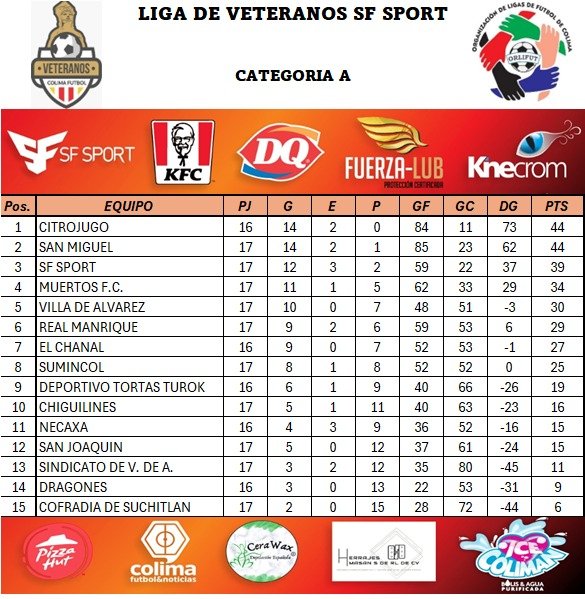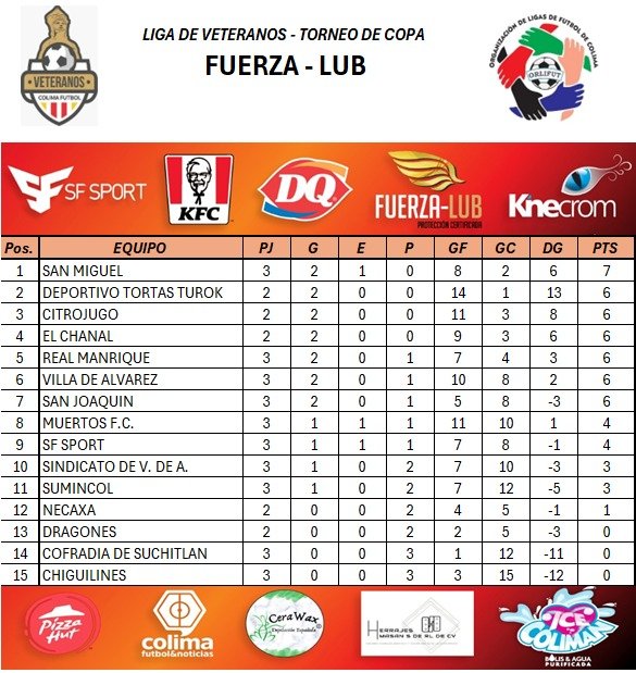 En la Copa Fuerza-Lub, San Miguel es líder, 7 puntos; Deportivo Tortas Turok, Citrojugo, Chanal, RealManrique, Villa de Álvarez, y San Joaquín, 6; Muertos F.C. y SF Sport, 4; Sindicato de Villa de Álvarez y Sumincol, 3; Necaxa, 1; Dragones, Cofradía de Suchitlán y Chigüilines, 0.