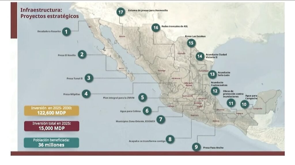 Al presentar los avances del Plan Nacional Hídrico 2024-2030, el funcionario federal resaltó que éste tiene como objetivo fundamental garantizar el derecho humano al agua, y recordó que los proyectos de infraestructura se dividen en dos rubros: 17 proyectos estratégicos seleccionados a partir de las regiones del país con mayor escasez de agua y el Plan Maestro que parte de un diagnóstico y de las necesidades a lo largo del país a nivel municipal.