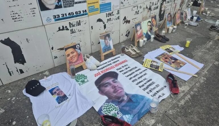 “¿Alguien fuma o tiene un encendedor?”, preguntó una madre buscadora. El viento arreciaba, en cuanto prendían una veladora se apagaba, pero volvían a encenderla. Así ocurrió al menos tres veces hasta que comenzaron a cortar vasos de plástico para ponerlos encima de la llama, para protegerla. Así se quedaron prendidas. Ahora tocaba el turno de los zapatos, tenis, o una prenda de ropa, colocadas al pie de la fotografía de la persona desaparecida. En el marco del luto nacional “Nunca más, Teuchitlán”, integrantes del colectivo Familias Unidas por Nuestros Desaparecidos (FUNDEJ) se reunieron en la Glorieta de las y los desaparecidos para recordar a su ser querido y para exigir, una vez más, que las autoridades hagan su trabajo y encuentren a los que ya no están.