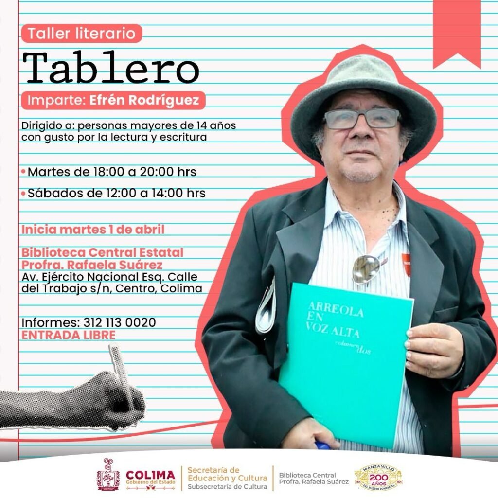 La Subsecretaría de Cultura del Gobierno del Estado de Colima anunció el regreso del taller literario ‘Tablero’, impartido por el escritor colimense Efrén Rodríguez Mendoza, un espacio que invita a todas las personas mayores de catorce años interesadas en la creación literaria, que deseen comenzar su formación como escritoras.