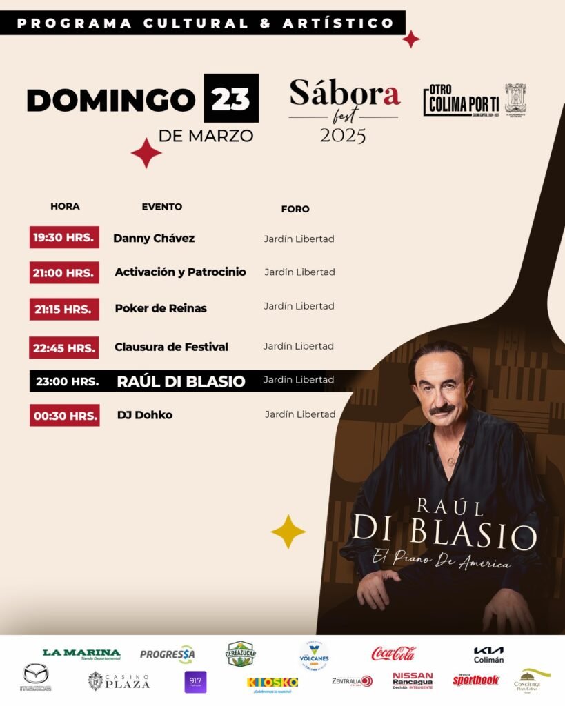 Con la presentación del pianista internacional Raúl di Blasio, “el Piano de América” este domingo llegará a su fin el festival Sábora Fest 2025, el cual ha sido un rotundo éxito, rebasando las expectativas respecto al número de asistentes que se ha dado cita en el Jardín Libertad de la ciudad de Colima, el cual ha registrado llenos impresionante