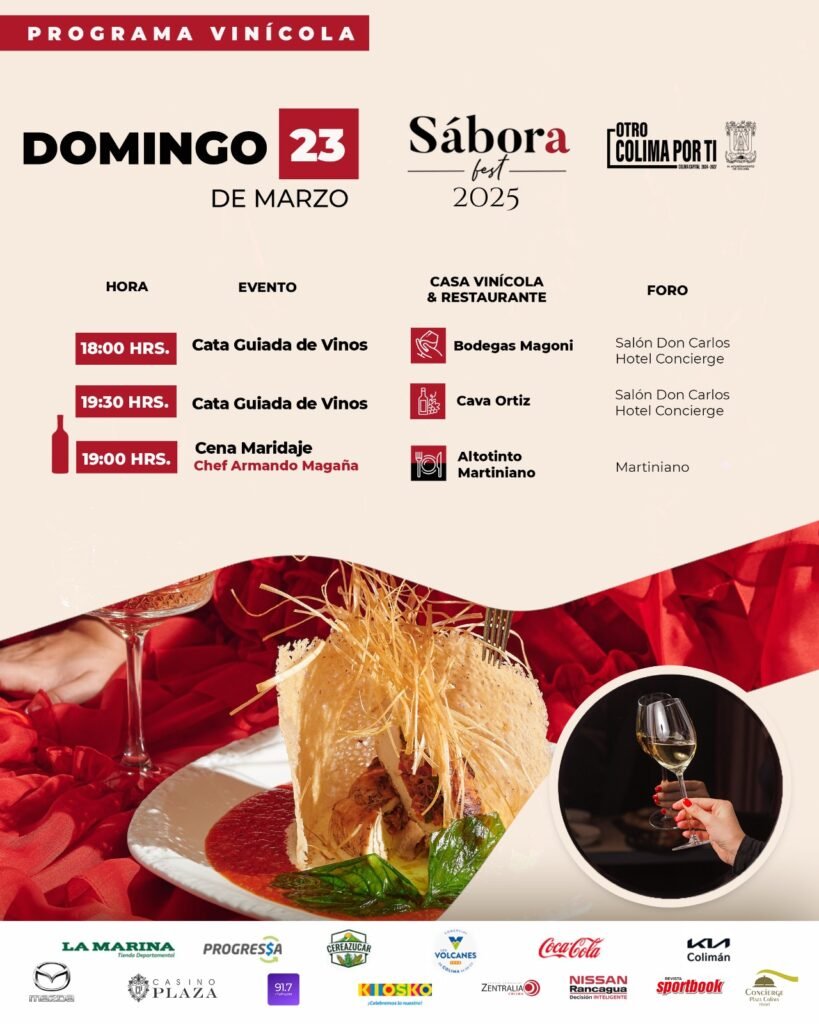 Asimismo a las 19:00 horas, se desarrollará la última Cena Maridaje de este año, a cargo del chef Armando Magaña, y la participación de la casa vinícola Altotinto y el restaurante, en el foro Martiniano Martiniano y con ello concluirán las actividades culturales que se programaron en esta edición 2025.