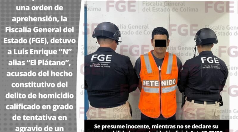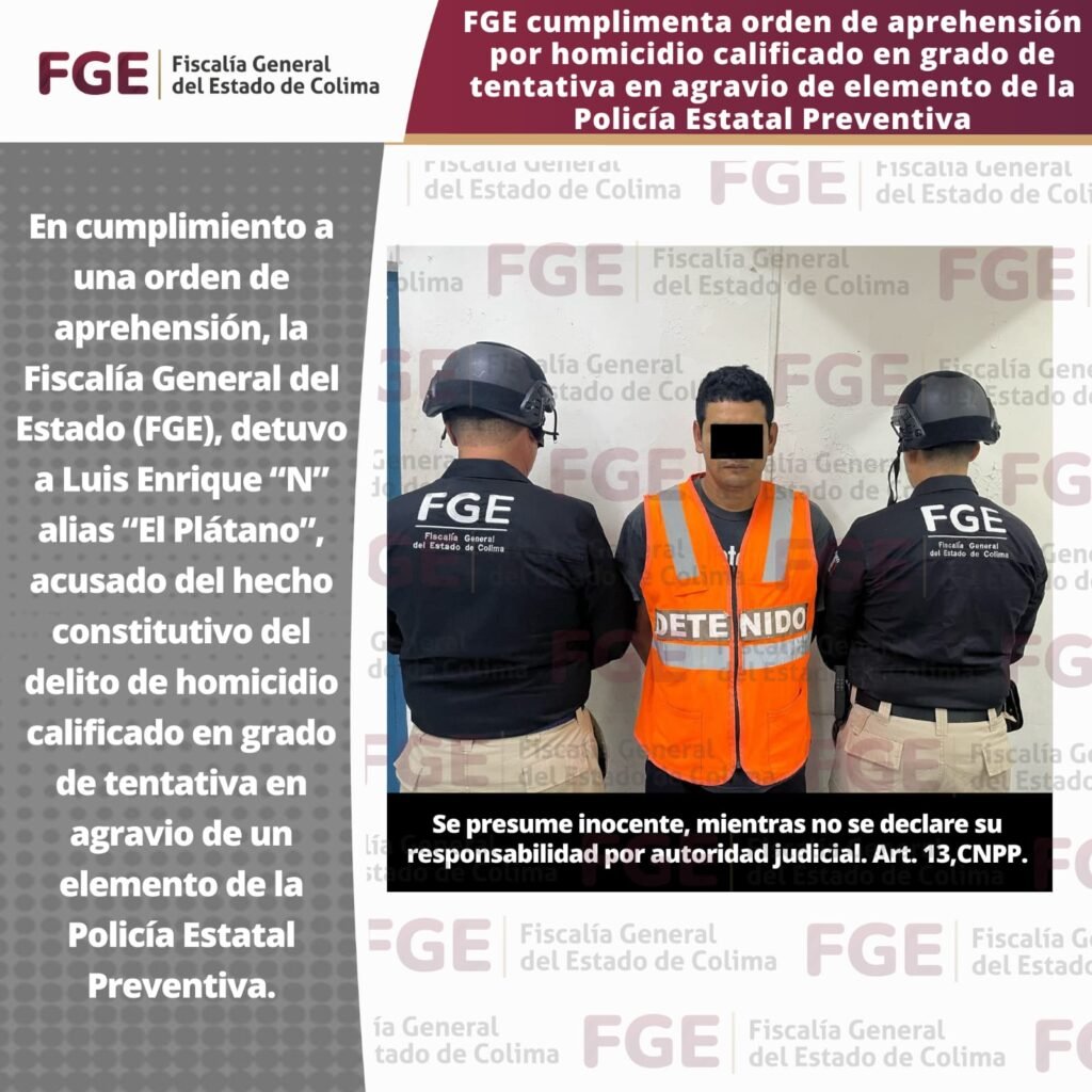 En cumplimiento a una orden de aprehensión, la Fiscalía General del Estado (FGE), detuvo a Luis Enrique “N” alias “El Plátano”, acusado del hecho constitutivo del delito de homicidio calificado en grado de tentativa en agravio de un elemento de la Policía Estatal Preventiva.