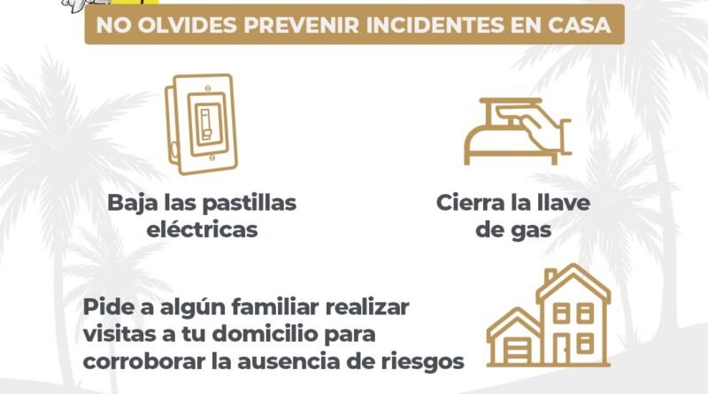 La dependencia estatal recuerda que es muy importante evitar que quede conectado cualquier aparato electrónico que pueda causar algún corto o daño a la red eléctrica; cerrar las llaves del agua y gas, ya que durante los días de ausencia no se necesitarán.