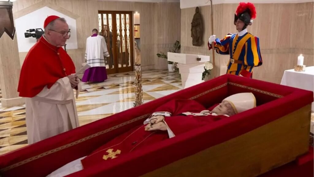 El Papa descansa sobre un féretro de madera forrado de terciopelo rojo con una casulla púrpura y una mitra blanca … Sigue leyendo El Vaticano publica la primera imagen de la capilla ardiente del Papa Francisco