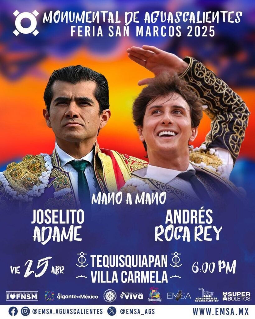 Como se sabe, los diestros encartelados en el día fuerte de las fiestas en honor al evangelista San Marcos, son el anfitrión Joselito Adame y el peruano Andrés Roca Rey, en mano a mano. (www.suertematadortoros.com)