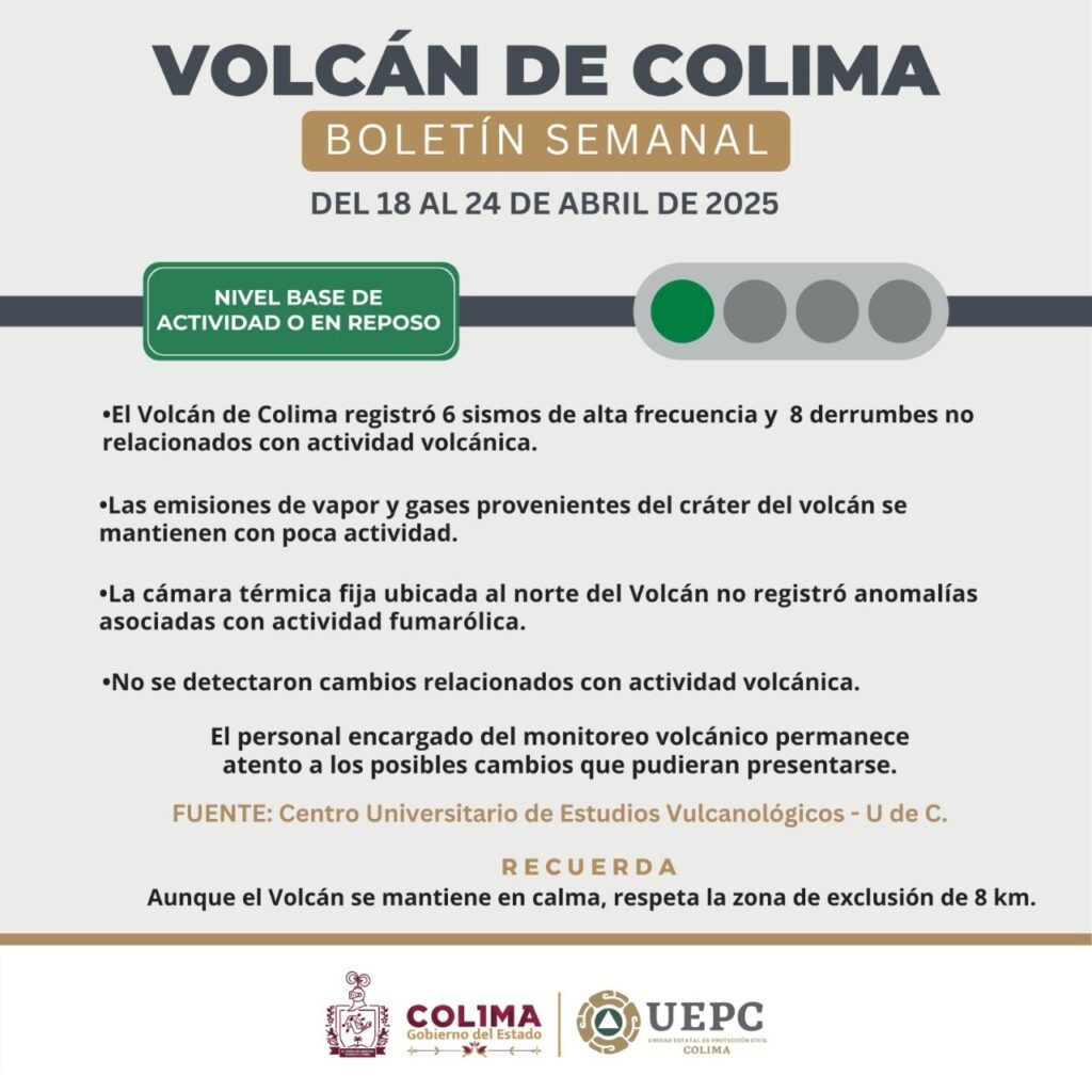 Del viernes 18 al jueves 24 de abril de 2025, el Centro Universitario de Estudios Vulcanológicos (CUEV) de la Universidad de Colima contabilizó de forma manual seis sismos de alta frecuencia y ocho derrumbes, ninguno de ellos relacionado con actividad volcánica, descartando explosiones y/o anomalías térmicas asociadas con la actividad fumarólica.