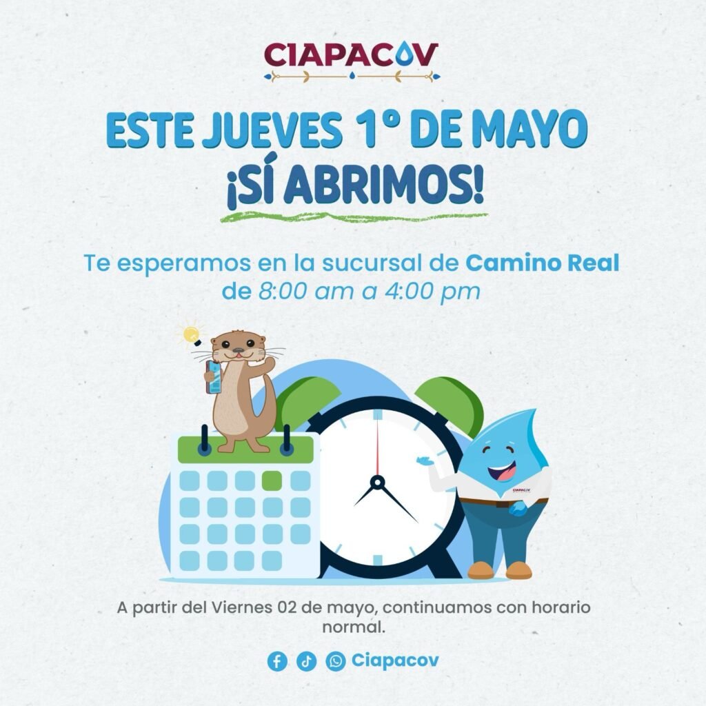 El Director General de la Comisión Intermunicipal de Agua Potable y Alcantarillado de los Municipios de Colima y Villa de Álvarez (CIAPACOV), Vladimir Parra Barragán, informó a través de redes sociales que este 1° de Mayo, día feriado, el módulo ubicado en la Av. Camino Real en Colima, se mantendrá abierto en un horario de 8 a.m. a 4:00 p.m.