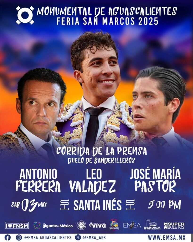 La terna torera que lidiará este hato aquicalidense y, que se disputará el trofeo de La Prensa especializada, la integran el balear Antonio Ferrera y los locales Leo Valadez y José María Pastor, tres espadas que dominan de forma espectacular el tercio de banderillas. (www.suertematadortoros.com)