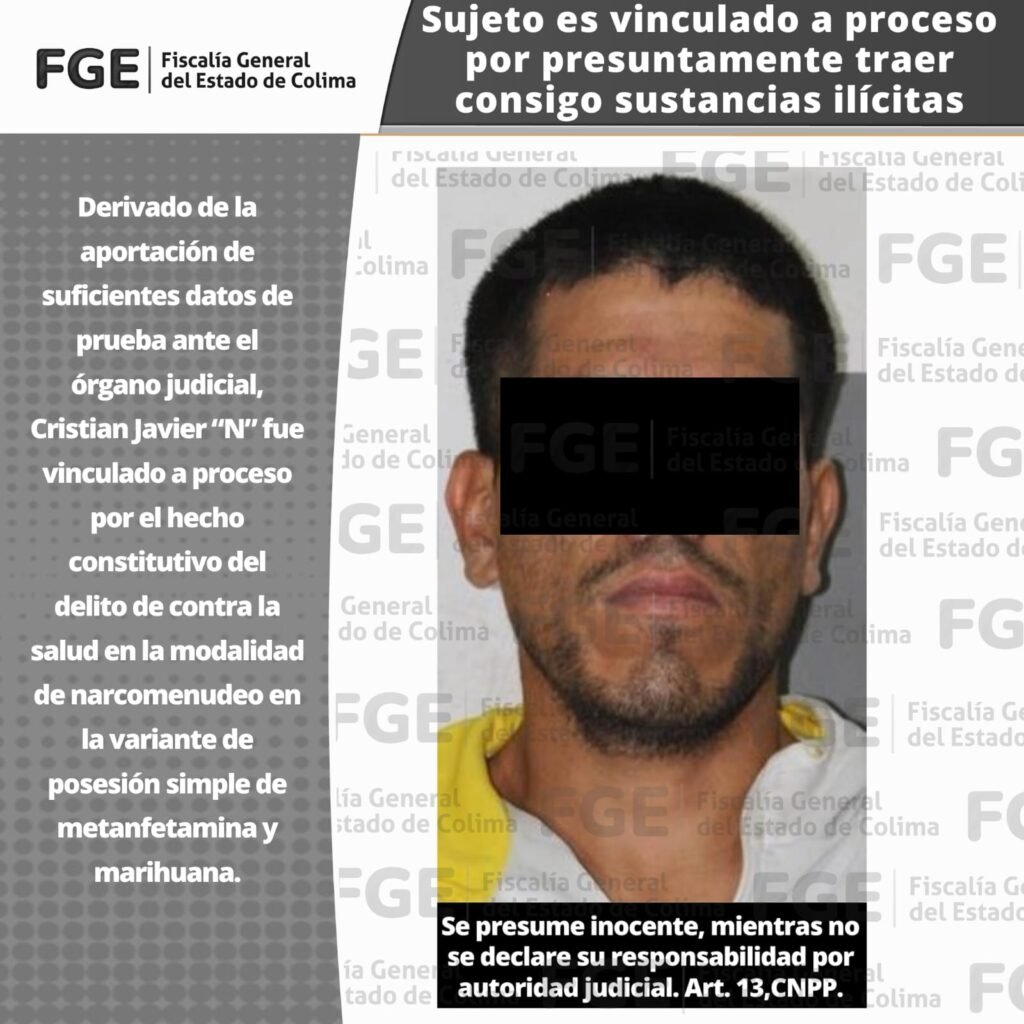 Derivado de la aportación de suficientes datos de prueba ante el órgano judicial, Cristian Javier “N” fue vinculado a proceso por el hecho constitutivo del delito de contra la salud en la modalidad de narcomenudeo en la variante de posesión simple de metanfetamina y marihuana.