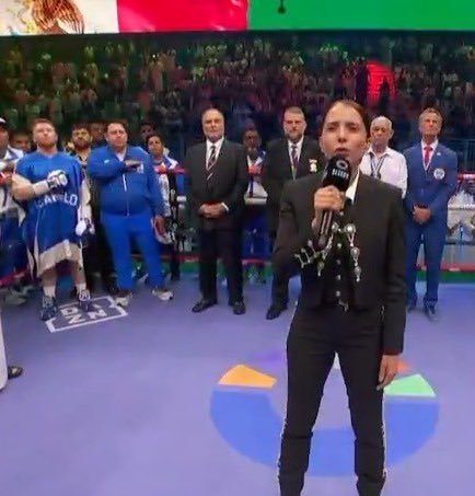 Fiel a la costumbre en los combates de este tipo, el Himno Nacional Mexicano fue interpretado por una reconocida figura del ámbito musical: Majo Aguilar, cantante y compositora originaria de la Ciudad de México, nacida en 1994. Considerada como una de las grandes promesas del regional mexicano, la cantante se encontró con el legendario Julio César Chávez momentos antes de esta importante presentación.
