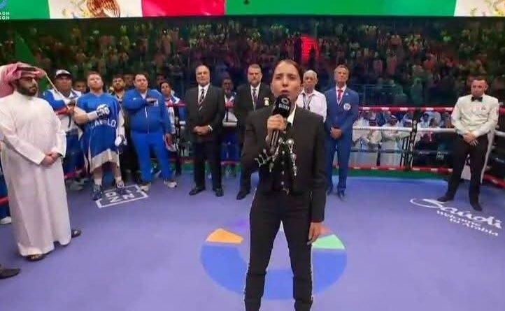 De un momento a otro, toda la arena se quedó en silencio para darle paso a la interpretación de Majo Aguilar, quien con una voz espectacular puso en alto el orgullo mexicano que carga en cada una de sus presentaciones. Completamente a capella, la integrante de la dinastía Aguilar usó su voz entrenada para la música ranchera e hizo rugir a toda Arabia Saudita; con una pronunciación limpia y sin ningún error, Majo inuaguró una de las peleas más esperadas alrededor del mundo.