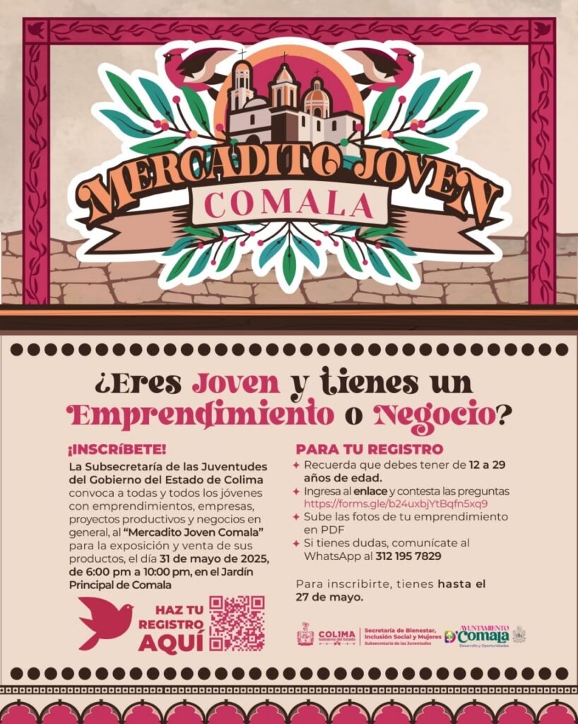 El subsecretario de las Juventudes del Gobierno del Estado de Colima, José Gerardo Romero Quezada, informa que ya están abiertas las inscripciones para registrarse como emprendedoras y emprendedores en la primera edición del Mercadito Joven, que se realizará en el municipio de Comala el sábado 31 de mayo.