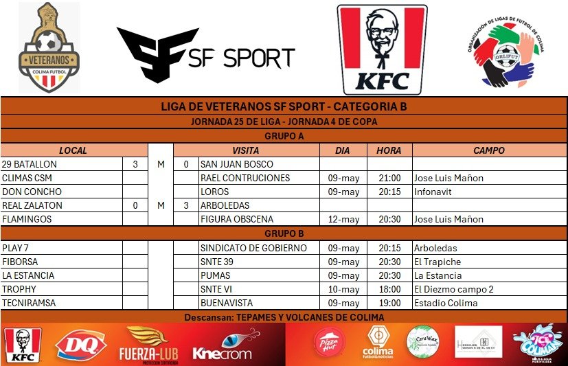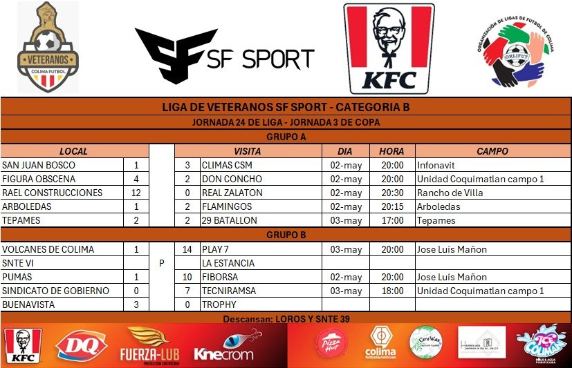 Finalmente, en cuanto a los resultados de la Jornada 24 de Liga y 3 de Copa: San Juan Bosco 1-3 Climas CSM; Figura Obscena 4-2 Don Concho; Rael Construcciones 12-0 a Real Zalatón; Arboledas 1-2 Flamingos; Tepames 2-2 con 29 Batallón; Volcanes de Colima 1-14 Play 7; Pumas 1-10 Fiborsa; Sindicato de Gobierno 0-7 Tecniramsa; Buenavista 3-0 Tropy (mesa). Queda pendiente el juego SNTE 6 vs. La Estancia.