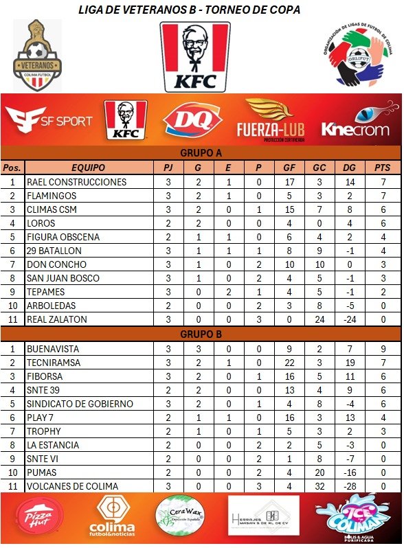 En la Copa “Fuerza Lub”, el Grupo “A” lo comparten Rael Construcciones y Flamingos, con 7 puntos; Climas CSM y Loros, 6; Figura Obscena y 29 Batallón, 4; Don Concho y San Juan Bosco, 3; Tepames, 2; Arboledas y Real Zalatón, 0.