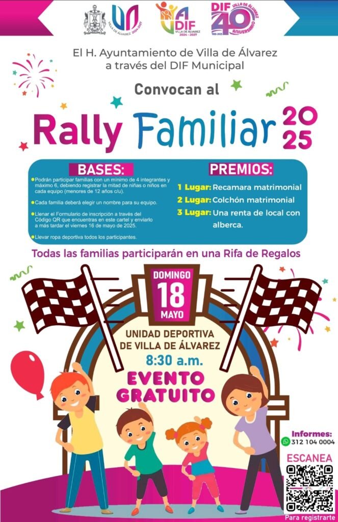 El Ayuntamiento de Villa de Álvarez, a través del DIF Municipal, emitió la convocatoria para el Rally Familiar, el cual se realizará este domingo 18 de mayo en la Unidad Deportiva “Profesor Gil Cabrera Gudiño”, a partir de las 8:30 de la mañana.