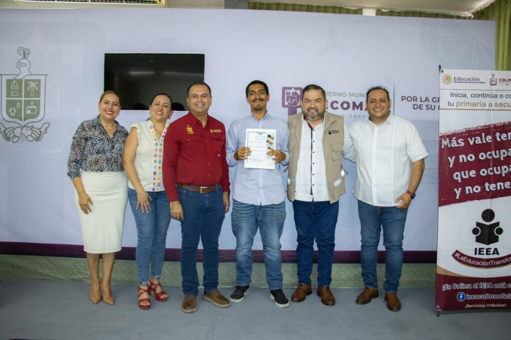 El presidente municipal de Tecomán, Armando Reyna Magaña, en compañía de Guillermo Toscano Reyes, director general del Instituto Estatal de Educación para Adultos (IEEA) en Colima, encabezaron la entrega de constancias de nivel primaria y secundaria a adultos del municipio, como resultado de la exitosa campaña “Más vale tenerlo y no ocuparlo que ocuparlo y no tenerlo”.