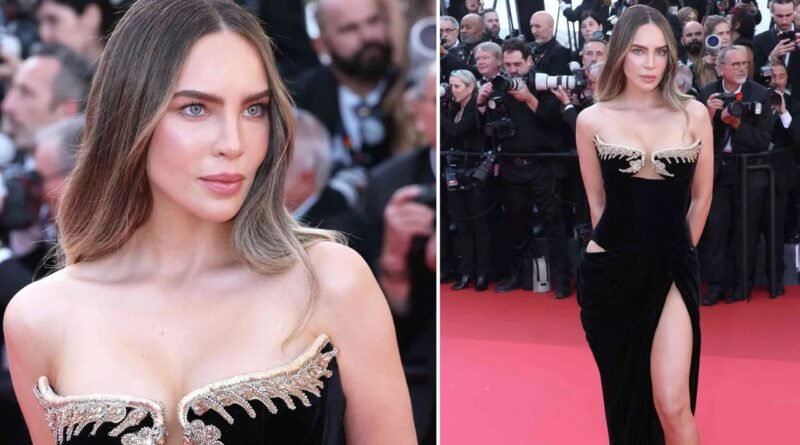El diseño, aunque atrevido no violó las reglas de vestimenta del Festival, y contiene un bordado dorado que enmarca el escote de un bodysuit de terciopelo negro, además de una falda larga que crea el efecto de estar sobrepuesta y que deja ver una abertura lateral y que acompañó con unas sandalias de los 90.