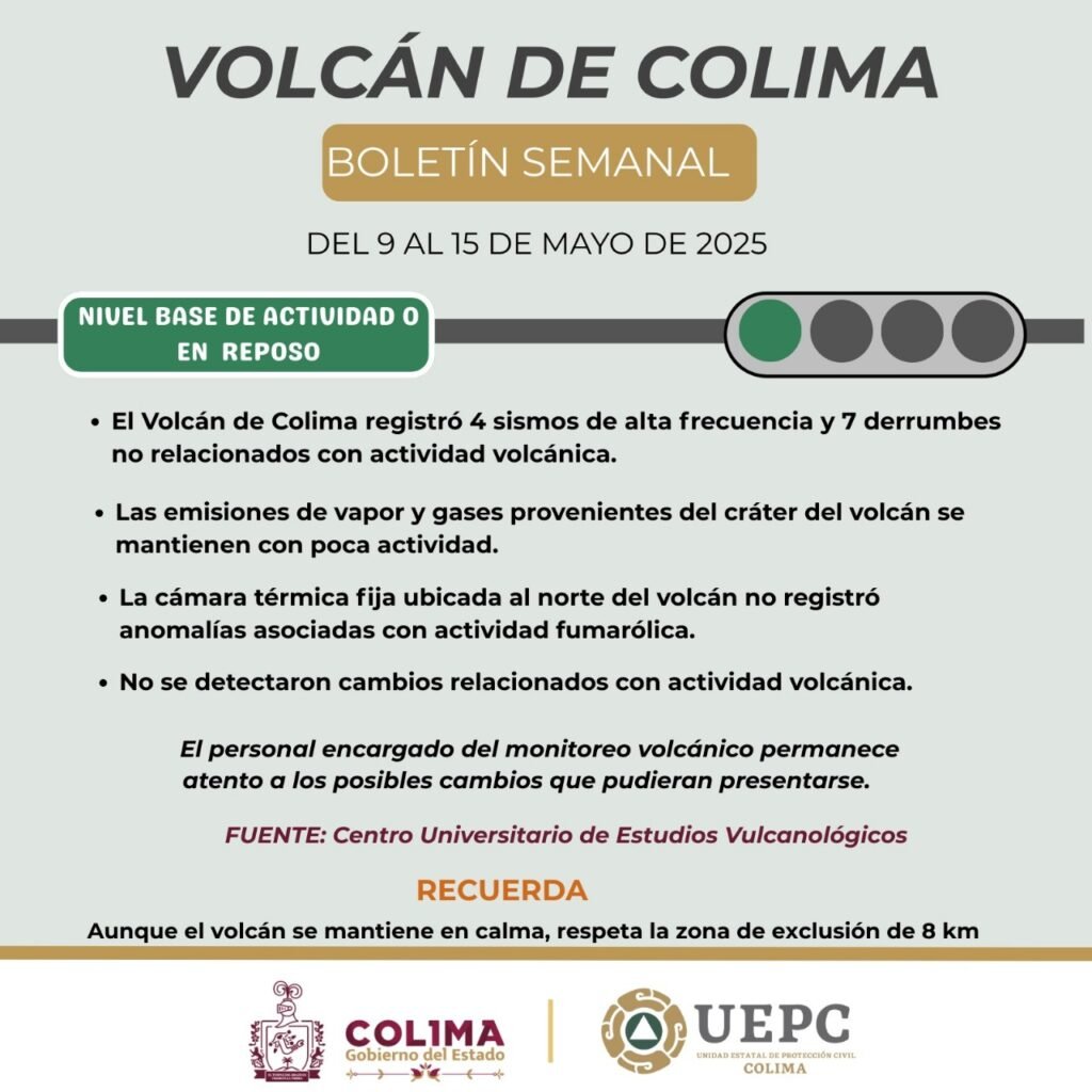 La Unidad Estatal de Protección Civil (UEPC) del Gobierno del Estado de Colima informa que el Volcán de Fuego registró cuatro sismos de alta frecuencia y siete derrumbes durante la semana del 9 al 15 de mayo, esta actividad no presenta cambios en el estado del coloso, el cual se mantiene en calma y continúa en ‘semáforo verde’.