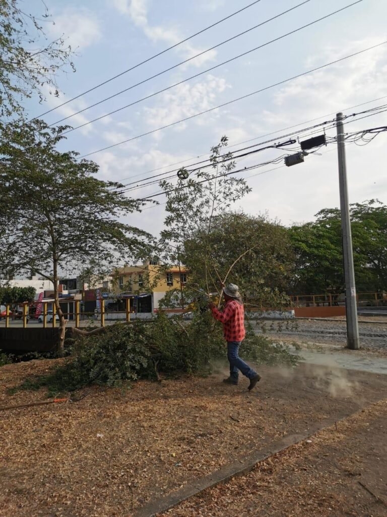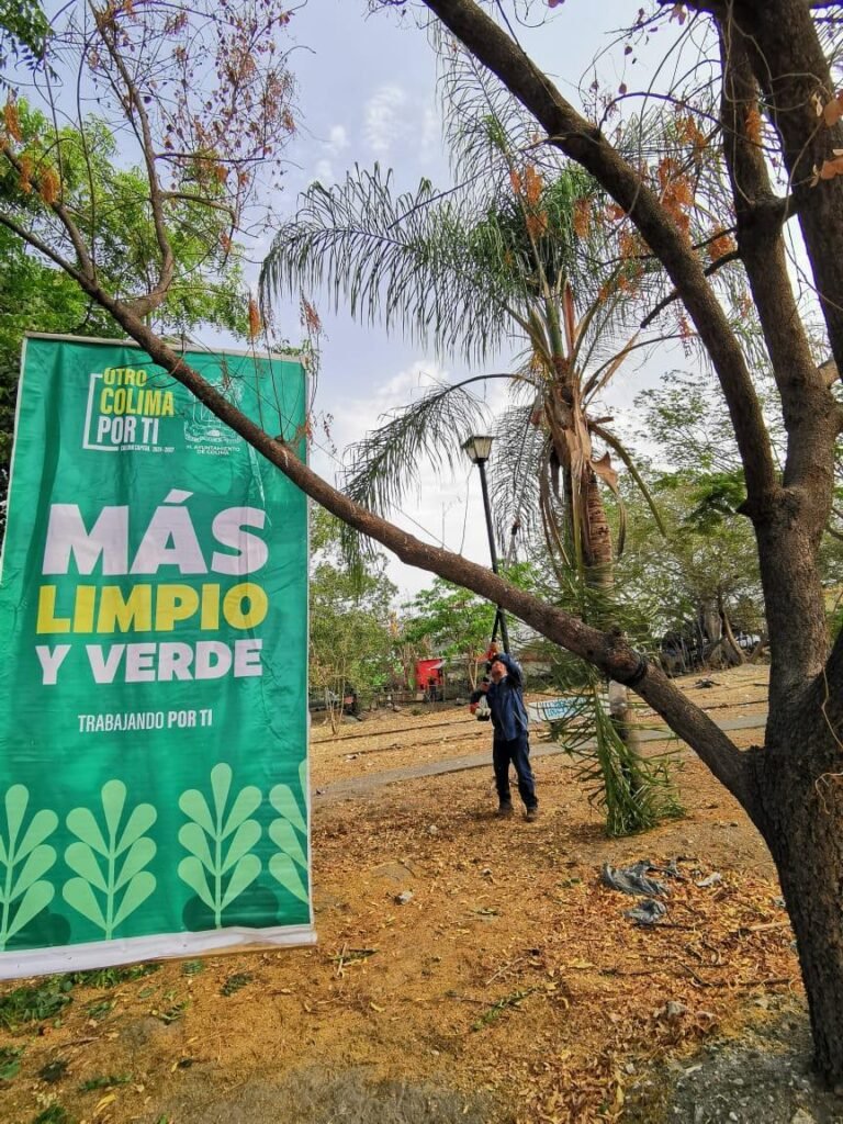 En cumplimiento de la instrucción del presidente municipal Riult Rivera, el Ayuntamiento de Colima continúa con el programa integral de mantenimiento de áreas verdes, llevando a cabo labores de limpieza y poda en el jardín principal de la colonia Bosques del Sur, al sur de la ciudad.