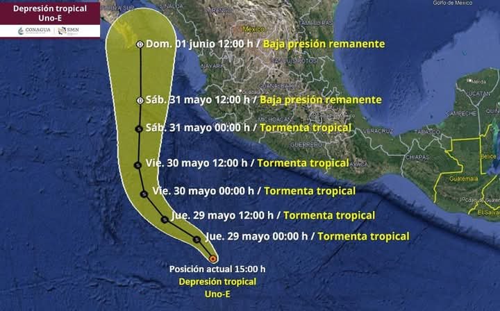 El pronóstico actualizado del Servicio Meteorológico Nacional (SMN) ubica la depresión tropical Uno-E a 720 kilómetros al sur-suroeste de Zihuatanejo, Guerrero, y a 1,340 kilómetros al sur-sureste de Cabo San Lucas, Baja California Sur