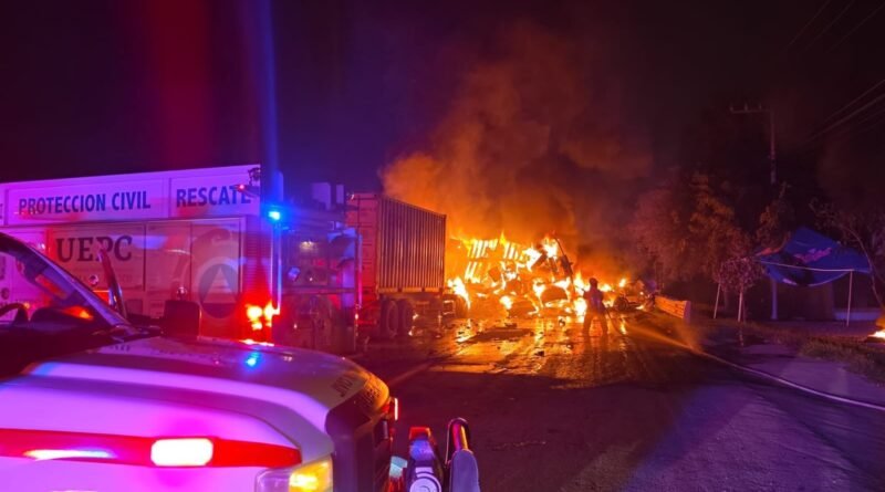 La Unidad Estatal de Protección Civil (UEPC) del Gobierno del Estado de Colima informa que personal operativo atendió un fuerte accidente registrado la madrugada de este jueves sobre la autopista Manzanillo-Colima, con dirección a la capital, a la altura del crucero de Loma de Fátima, donde dos tráileres colisionaron y posteriormente se incendiaron, ocasionando la obstrucción total de los tres carriles de circulación.