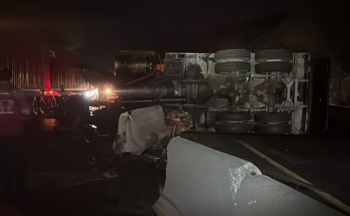 La Unidad Estatal de Protección Civil (UEPC) del Gobierno del Estado de Colima informa que, la madrugada de este viernes se registró un accidente sobre la autopista Colima-Manzanillo, a la altura del kilómetro 22, en el tramo conocido como La Salada, donde un camión de carga tipo torton chocó contra el muro de contención e invadió los dos carriles con dirección de Tecomán a la capital, tras quedar volcado sobre la vía.