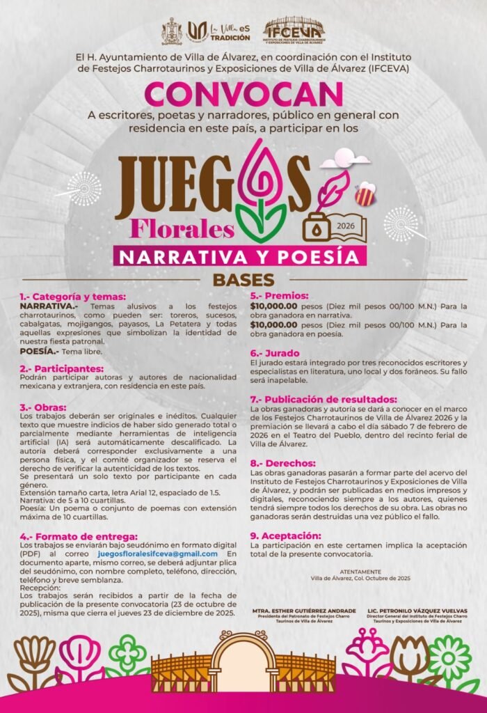 Petronilo Vázquez, Director del Instituto de Festejos Charro Taurinos y Exposiciones de Villa de Álvarez, apuntó que en los Juegos Florales Narrativa y Poesía 2026 podrán participar autoras y autores de nacionalidad mexicana o extranjera, con residencia en cualquier lugar del país, cuyos ganadoras o ganadores recibirán en cada categoría un premio de 10 mil pesos.