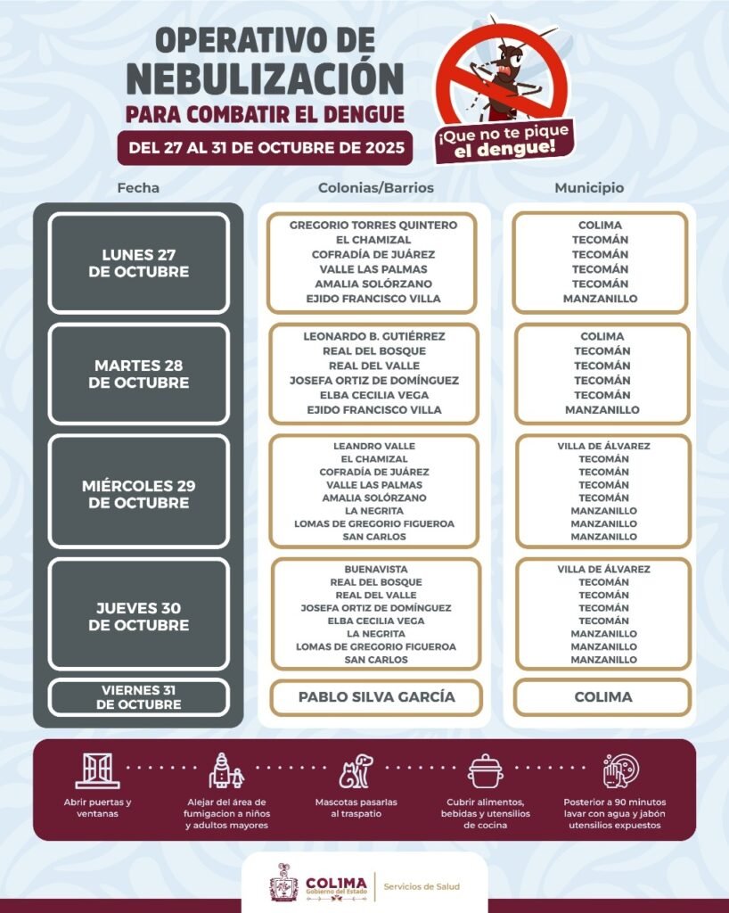 Para disminuir la presencia del mosco transmisor del dengue, zika y chikungunya, la Secretaría de Salud del Gobierno del Estado de Colima lleva a cabo del lunes 27 al viernes 31 de octubre el operativo de fumigación en los cuatro municipios más grandes de nuestra entidad, nuevamente.