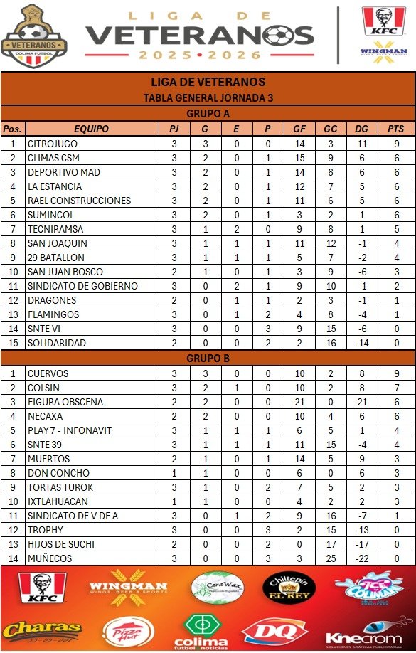 Después de tres Jornadas, el Grupo “A” lo domina Citrojugo, con 9 puntos; Climas CSM, Deportivo Mad, La Estancia, Rael Construcciones y Sumincol, con 6 unidades; Tecniramsa, 5; San Joaquín y 29 Batallón, 4; San Juan Bosco, 3; Sindicato de Gobierno, 2; Dragones y Flamingos, 1; SNTE 6 y Solidaridad, 0.