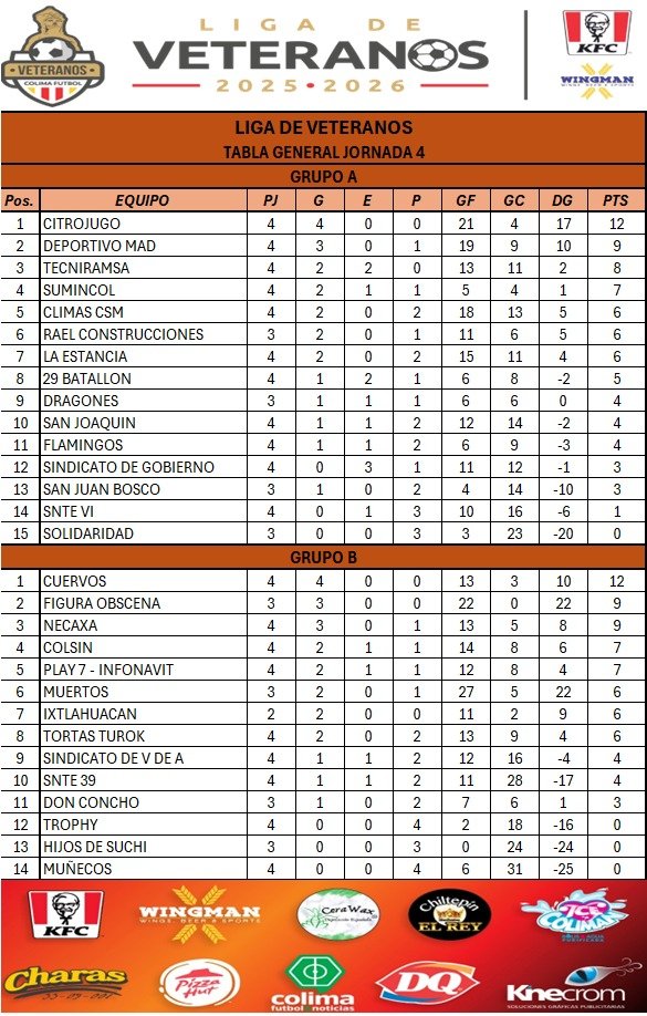 Finalmente, las estadísticas después de cuatros Jornadas van así, por el sector uno, Citrojugo es líder con 12 puntos; Deportivo Mad, 9; Tecniramsa, 8; Sumincol, 7; Climas CSM, Rael Construcciones y La Estancia, 6; 29 Batallón, 5; Dragones, San Joaquín y Flamingos, 4; Sindicato de Gobierno y San Juan Bosco, 3; SNTE 6, 1; Solidaridad, 0.