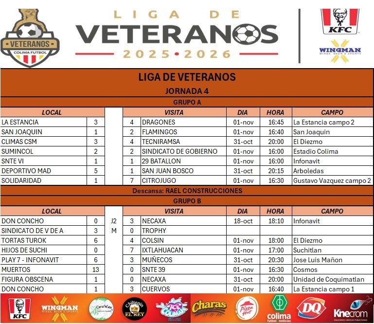 Tocante a la cuarta Jornada del Torneo de Liga, por el grupo uno Citrojugo goleó 7-1 a Solidaridad; Dragones venció 4-3 a La Estancia; Flamingos 2-1 a San Joaquín; Tecniramsa 4-3 a Climas CSM; Sumincol 2-2 Sindicato de Gobierno; SNTE 6 empató 1-1 con 29 Batallón y Deportivo Mad 5-1 San Juan Bosco. Descansó Rael Construcciones.