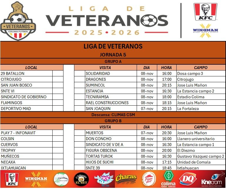 Ese mismo día, pero a las 4:30 de la tarde chocarán Cuervos contra Sindicato de Villa de Álvarez, en el campo 1 de La Estancia, así como Muñecos encarando a Tortas Turok, en el rectángulo 2 de la Unidad GVM de Villa de Álvarez.