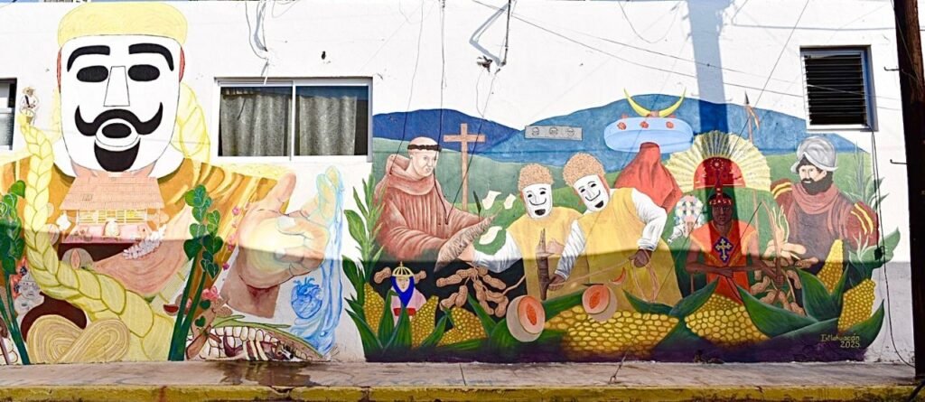 Este mural, elaborado con la participación de habitantes de la localidad -de diferentes edades-, reúne elementos distintivos de la historia y el legado artístico de la comunidad indígena de Ixtlahuacán: en él aparece el capitán Gonzalo de Sandoval junto a un danzante ataviado con la indumentaria típica de la Danza de Apaches, recordando la conquista y la resistencia indígena.
