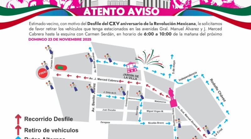 Por la celebración del desfile, las avenidas General Manuel Álvarez y J. Merced Cabrera, hasta llegar a la calle Carmen Serdán, estarán cerradas a la circulación vial desde las 6:00 hasta las 10:00 de la mañana, por lo que además se pide a la población no estacionarse en esas vialidades desde las 6 de la mañana.