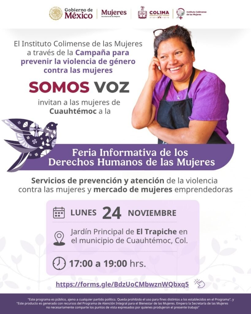 El Gobierno del Estado de Colima, a través del Instituto Colimense de las Mujeres (ICM), invita a la ciudadanía a asistir y participar en la Feria Informativa de los Derechos Humanos de las Mujeres, que se realizará el próximo lunes 24 de noviembre en el jardín principal de la comunidad de El Trapiche, en el municipio de Cuauhtémoc, de 5:00 a 7:00 de la tarde.