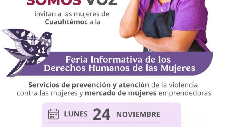 El Gobierno del Estado de Colima, a través del Instituto Colimense de las Mujeres (ICM), invita a la ciudadanía a asistir y participar en la Feria Informativa de los Derechos Humanos de las Mujeres, que se realizará el próximo lunes 24 de noviembre en el jardín principal de la comunidad de El Trapiche, en el municipio de Cuauhtémoc, de 5:00 a 7:00 de la tarde.
