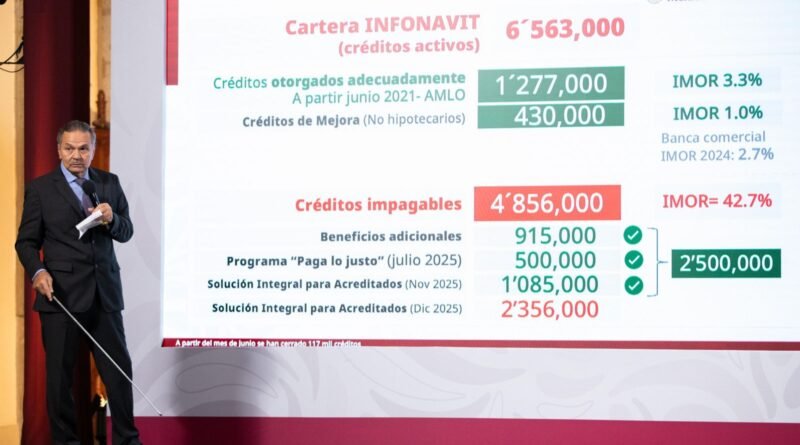También informó que, de los 4 millones 856 mil créditos impagables, 915 mil ya recibieron beneficios adicionales como descuentos al saldo, baja de tasa de interés y de mensualidad; 500 mil fueron atendidos a través del programa Paga lo Justo y con Solución Integral 1 millón 85 mil, al cierre de noviembre. Para finalizar el año, se atenderán los 2 millones 356 mil créditos restantes, con lo que quedará resuelta toda la cartera impagable del Instituto.